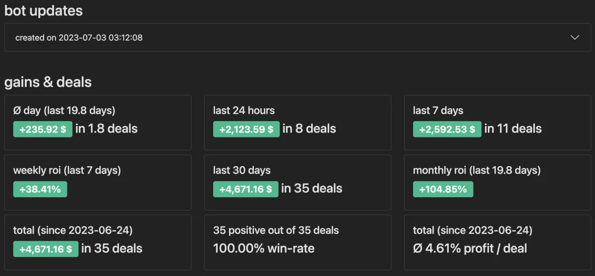 The Botcave democratized formerly exclusive knowledge, making it accessible to the average individual. Marco Polo employs Dollar Cost Averaging (DCA) strategy, surpassing traditional indicators by meticulously analyzing market behaviors and leveraging volatility patterns. Users have warmly embraced Marco Polo, with some sharing their bot-generated profits in our live results channel on Discord. We invite you to be the next to celebrate your successes with us.